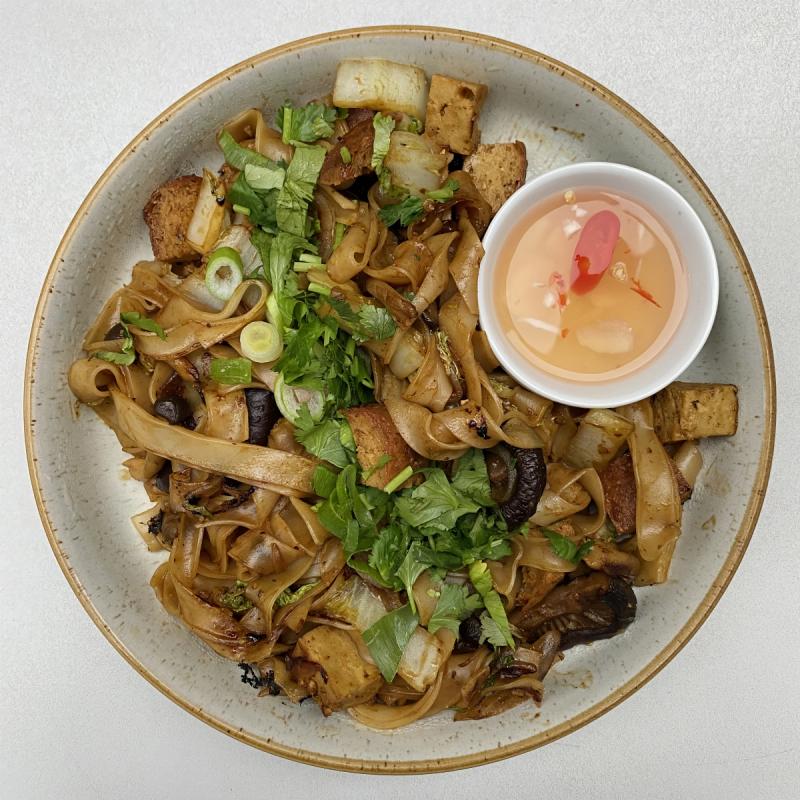 Dobrze Wam znany daleki kuzyn Pad Thaia (niezmiennie twierdzimy, że znacznie ciekawszy). Szeroki ryżowy makaron, seitanowe mięsko i azjatyckie grzyby smażone na dużym ogniu w ciemnym, słodko-słonym sosie – pełnia smaku umami i dymnego aromatu. Podajemy z dymką, kolendrą oraz tajskim octem z czosnkiem i chili Prik Nam Som, który idealnie uzupełnia danie.