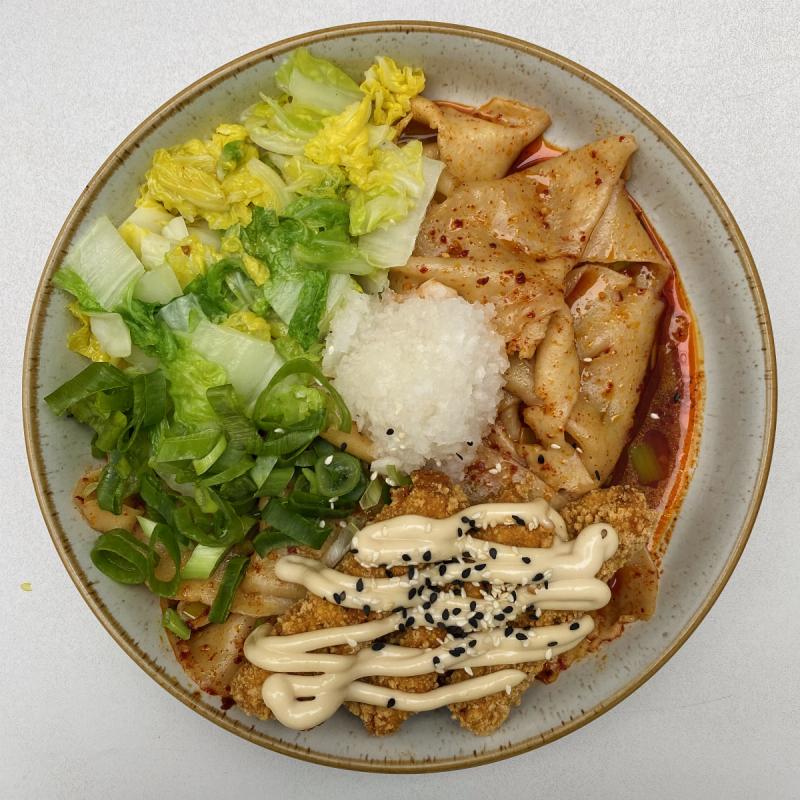 Ręcznie rozciągany makaron w formie długich wstążek podawany w klasycznym stylu chińskiej prowincji Shaanxi. Aromatyczne przyprawy – czosnek, pieprz syczuański, płatki chili i por zasmażamy gorącym olejem, by utworzyć wyjątkowy, pikantny sos, który charakterystycznie łaskocze podniebienie. Podajemy z blanszowaną kapustą, tartą rzodkwią i dymką, oraz chrupiącym tempehem.