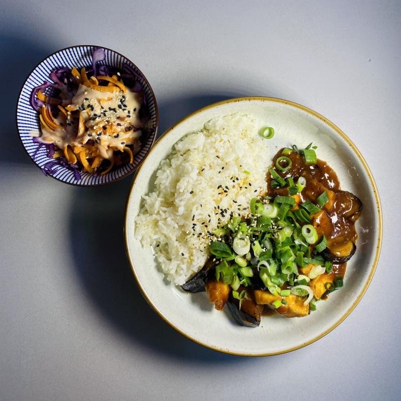 Miękkie i soczyste kawałki bakłażana oraz smażone tofu w mocno czosnkowym sosie ze słodką nutą. Intensywne w smaku, ale zasmakuje także fanom łagodnych dań. Podajemy z ryżem jaśminowym i super świeżą orientalną surówką.