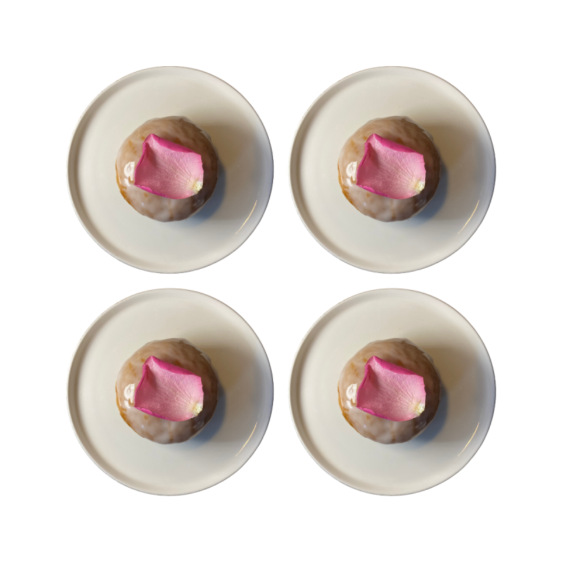 4 sztuki pączków wypełnionych konfiturą różaną, oblany klasycznym lukrem oraz świeżym płatkiem róży.