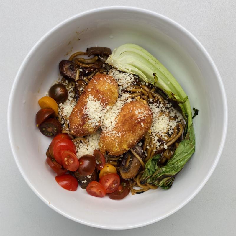 Francuska zupa cebulowa, ale to ramen! Makaron bez bulionu, w wersji stir-fry z obfitą porcją karmelizowanej cebuli, marynowanymi pieczarkami oraz ciemnym sosem sojowym z dodatkiem brandy. Całość podana z chrupiącymi krokietami serowymi, pomidorkami i roślinnym parmezanem.