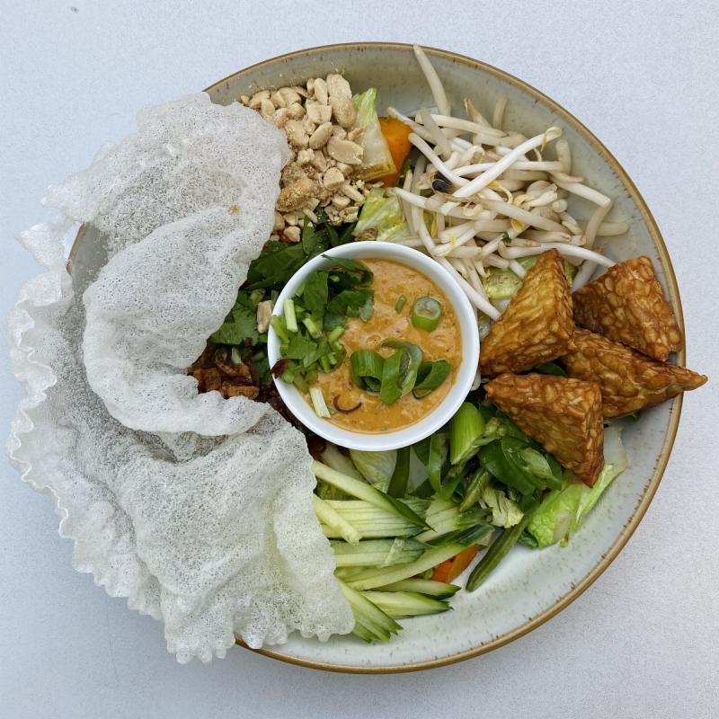 Indonezyjska sałatka z aromatycznym, kremowym sosem orzechowym. Połączenie blanszowanej kapusty i fasolki, kawałków dyni, świeżych warzyw i smażonego tempehu z ziołami, orzeszkami i prażoną szalotką. Podajemy z ryżowym krakersem.