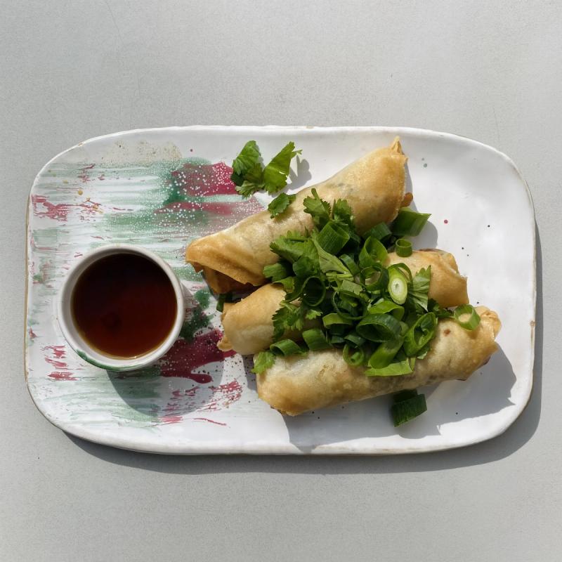 Trzy chrupiące sajgonki z pszennego ciasta nadziane mielonym sojowym mięskiem z dodatkiem warzyw, imbiru i czosnku. Podajemy po wietnamsku z kwaskowym sosem nước i świeżymi ziołami.