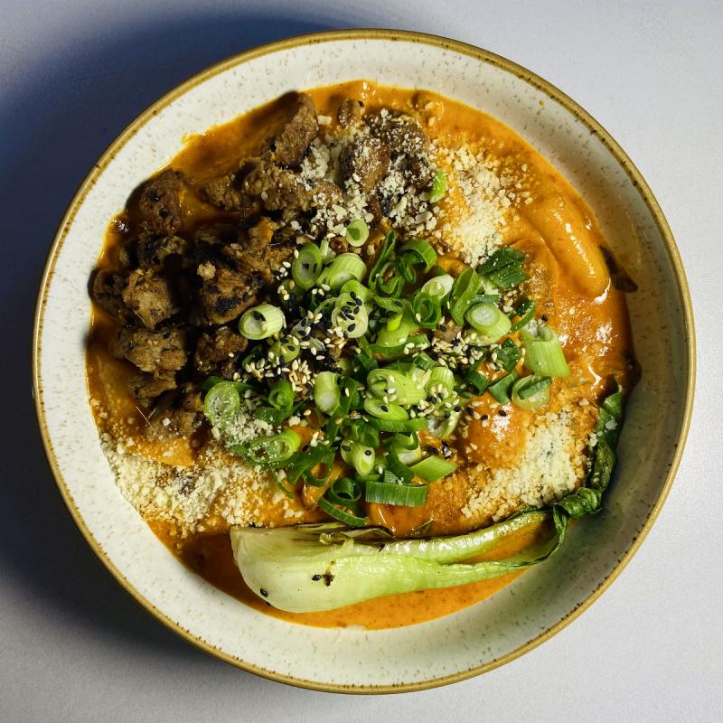 Must-try prosto z Korei. Robione ręcznie podłużne kluseczki ryżowe w kremowym, lekko pikantnym śmietanowo-serowym sosie (roślinnym oczywiście). Do tego smażone sojowe mięsko, dymka i pak choi. Wszystko posypane parmezanem. Piękne, pyszne, totalnie satysfakcjonujące.