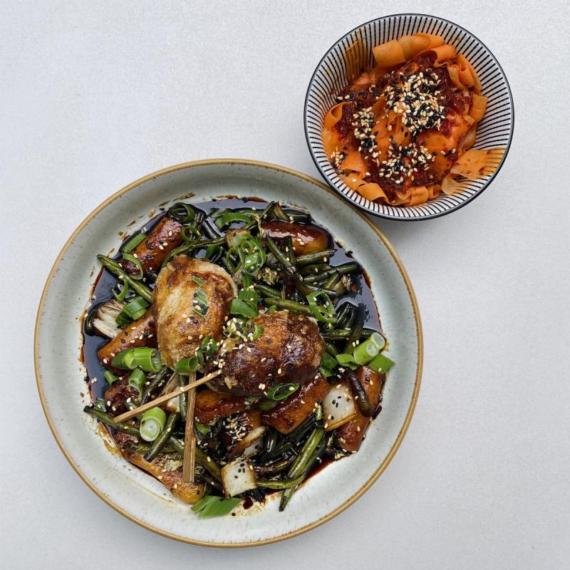 Koreańskie ryżowe kluski w wersji gungjung czyli z sosem na bazie sosu sojowego. Kluski robimy na miejscu i podajemy z roślinnymi udkami z seitanu i dyni, kapustą i zieloną fasolką, smażone w ciemnym, słono-słodkim sosie. Do tego pikantna marynowana marchewka, jako banchan, czyli orzeźwiający dodatek.