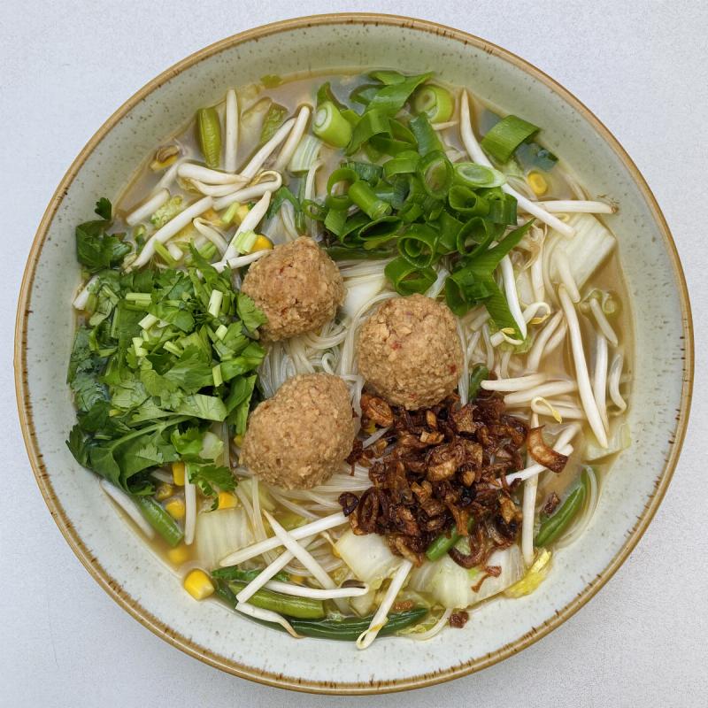 Kolejna pozycja z Indonezji, klasyczna zupa ze sprężystymi bezmięsnymi klopsikami. Rozgrzewający bulion z dodatkiem makaronu ryżowego, warzyw, prażonej szalotki i świeżej kolendry.