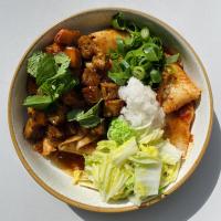 Podajemy z blanszowaną kapustą, tartą rzodkwią i dymką, oraz tofu z bakłażanem w sosie czosnkowym z kolendrą.