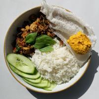 Trzy chrupiące sajgonki z pszennego ciasta nadziane mielonym sojowym mięskiem z dodatkiem warzyw, imbiru i czosnku. Podajemy po wietnamsku z kwaskowym sosem nước i świeżymi ziołami.